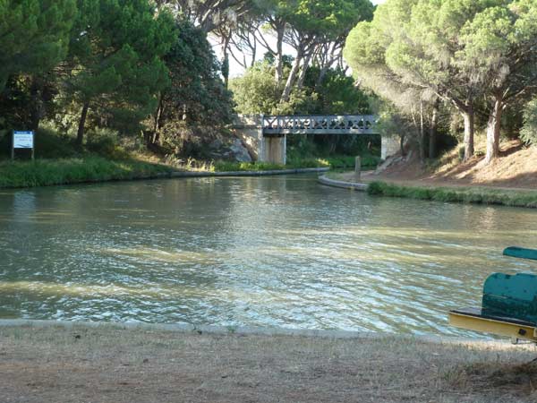 Noch einmal aus einer anderen Sicht: Von links unter der Brücke hindurch der Canal du Midi, rechts zweigt der Canal de Jonction ab, der als