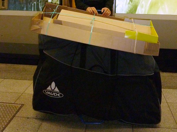 Die Tragetasche und der Karton, mit dem ich sie und die IKEA-Karre in Toulouse per Post - für 15 Euro relativ preiswert, wie ich finde - an den Endpunkt meiner Tour verfrachten werde, sobald das Fahrrad wieder auf eigenen Rädern rollt.