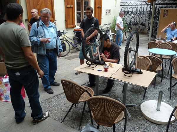 Hierher kommen viele Leute, um zu lernen, ihr Radl selbst zu repararieren. Die Werkstatt kann auch kostenlos genutzt werden, wenn man Vereinsmitglied mit 10 Euro Jahresbeitrag ist.