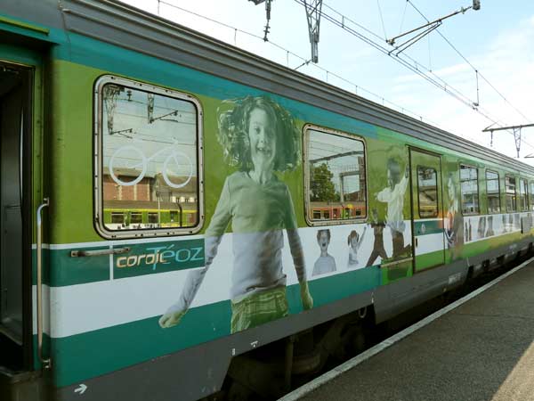 Der Zug - so eine Art Interregio, der die 950 km in bummligen 10 Stunden abreist - hat zwei Service-Waggons, für Räder, Rollstuhlfahrer und ....