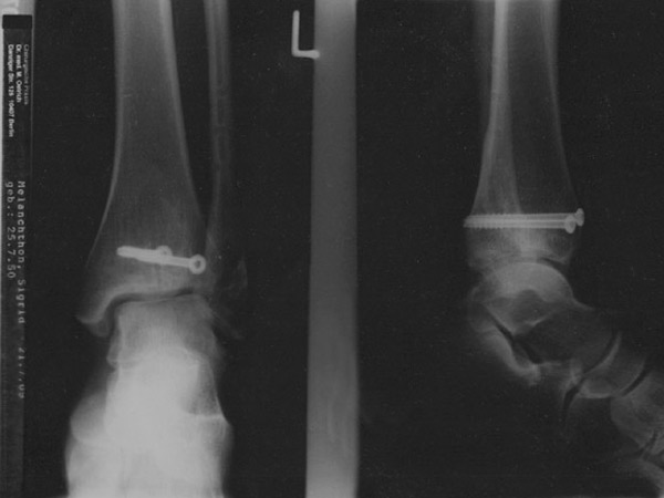 Diese beiden letzten, V-förmig von vorn nach hinten durch den Knöchel reichenden Schrauben werden am 28.07.2009 nach dem Seenland 100 - ein Jahr nach dem Unfall am 26.07.2009 - entfernt. Die Straße mit der tückischen Schiene wurde weggesprengt, um einen Verbindungskanal zwischen zwei Seen zu schaffen. Und das ist gut so! |