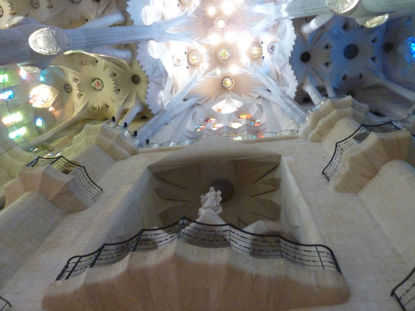 Die Decke des Mittelschiffs symbolisiert das Blätterdach, das sich über den als Baumstämmen konzipierten Säulen schließt