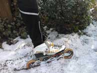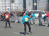 Und wir haben Glück: Morgens beim Einsteigen ins Auto zeigt das Thermometer noch -2 Grad Celsius, doch an der Karl-Marx-Allee sind es +3 Grad! Auf den Wiesen liegt noch ein wenig Schnee, aber die Sonne kommt rechtzeitig durch. Wegen der Kälte verteilten die fleißigen Helfer vor dem Start Wärmewesten. Nach und nach trudeln die Oldies und viele, viele andere Skater und Läufer an der Strecke ein. Alle sind glücklich und freuen sich auf das Rennen.