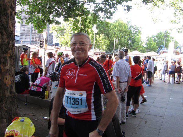 Am Treff. Die meisten suchen noch die Startnummernausgabe: diesmal auf der Dachterrasse über Karstadt-Sport.