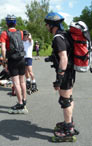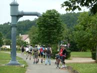 Zwei Gruppen von Skatern machen sich am Sonnabendmorgen von Annemasse und von Genf aus auf den Weg nach Cluny. Ein noch früher gestartetes Fahrzeug bringt unser Gepäck und vor allem den Grill direkt zum Camping du Pont de Bourgogne in Chalon-sur-Saône, wo wir übernachten werden. Dann stoßen die zwei Fahrerinnen am Startpunkt in Cluny zu uns. Wir skaten auf einer ehemaligen Eisenbahnstrecke, die Teil des Burgund-Radwege-Netzes ist.