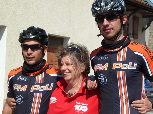 Die Rennleiterin mit den beiden Erstplatzierten, die Hand in Hand über die Ziellinie fahren