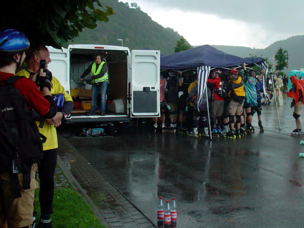 Nach 31 km erste Verpflegungspause mit dem nächsten heftigen Regenschauer.