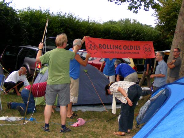 Zelte aufbauen und unser Banner anbringen, gerade noch im Trockenen