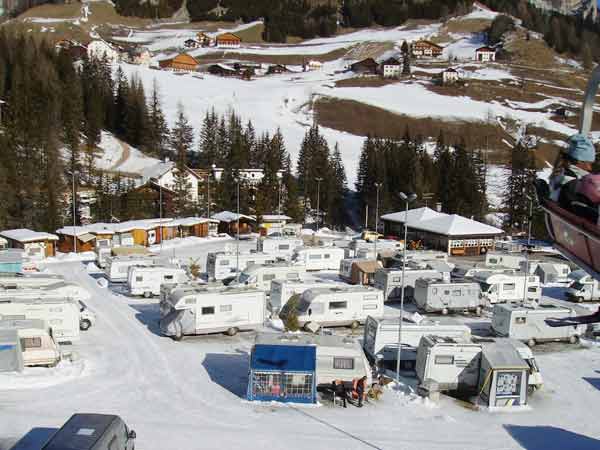 Wieder im Lift fast über den Campingplatz zwischen Corvara und Colfosco. Wer wissen will, wie das im Sommer hier aussieht, klickt